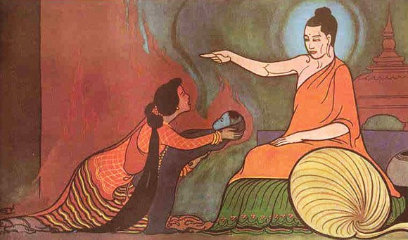 Le Bouddha commença alors à lui donner son enseignement : « si tu veux connaître la vérité sur la vie et la mort, tu dois réfléchir continuellement à ceci : la seule loi dans l’univers qui ne soit pas soumise au changement est que tout change et que tout est impermanent. La mort de ton enfant te permet de voir à présent que le royaume dans lequel nous vivons – le samsara – est un océan de souffrance intolérable. La seule et unique voie qui peut te conduire hors de cette ronde incessante des naissances et des morts est le chemin de la libération.